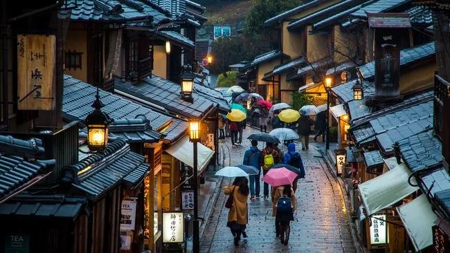 Historical area with traditional Japanese buildings.